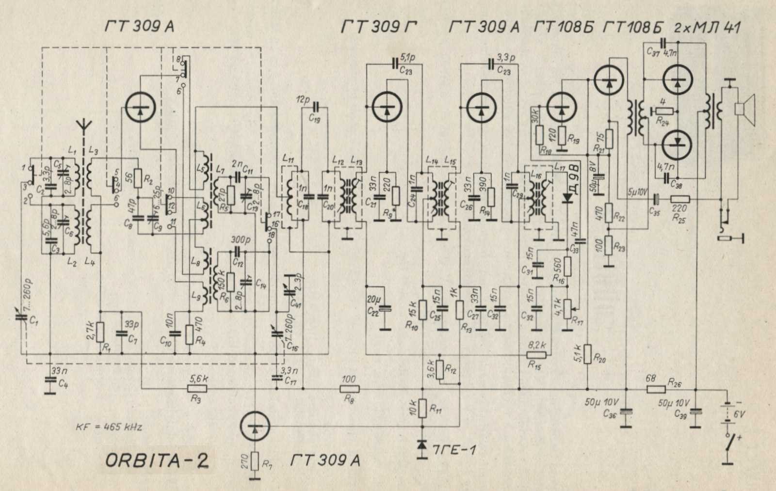 És ime a rajz. Az ember gondolná , hogy a rövid hullám miatt additiv keverést használnak , de nem...De furcsa módon betesznek egy tranzisztort az oszcilátor tranzisztor feszültségének stabilizálására. Nem kispályás fickók, az már biztos :-). Tehát van egy 8 tranzisztoros 14x8x4 cm-es kisrádió, közép és rövidhullámra komponálva. A tranzisztorokból tulajdonképpen 7 darab az aktív . Rövidhullámon az antena a ferritrúd , nem botantenna. Ennek az a feltétele , hogy kitünő minőségü legyen a ferritrúd. Ez adott,mivel tipusa 150HC . Itt is egy érdekesség, a vételi sávja 3,95 - 12 MHz között van, tehát 25m - 75m között. De a 49m és 80m közötti sáv nem nagyon volt használva , alig voltak ott adók. Na, de mindegy, ez a rádió ezt is tudja. A rádiót a Szovjetunióban , Rigában gyártották , ma Litvánia . Ezért van rajta három darab R betü = RRR = Rigas Radio Rupnica . Összesen 1,6 milliót gyártottak ,ebből több mint 1 milliót exportra szántak. A bemutatott példány is ilyen,azért vannak rajta a feliratok angolul.